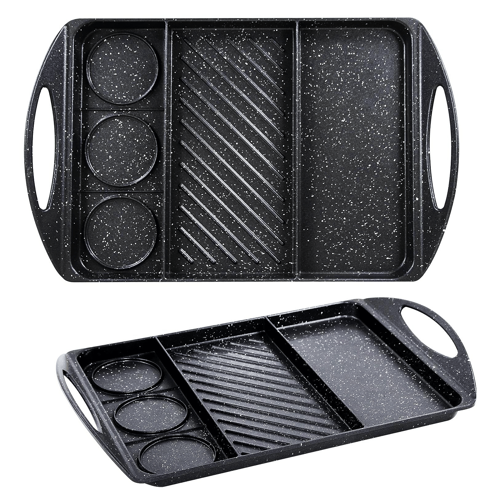 2.NON-STICK&NON-RUST COATING:The surface of our griddle has black colored granite ceramic coated easy release baking surface.Its rich cream flecks make this bakeware both fashion and high function, making cooking and cleaning easier.Your food won't stick,allowing you to create Insta-worthy meals every time.Food will cook up crisp outside,and tender inside.You'll make perfect pancakes,grilled cheese sandwiches,etc. Food slides right off and onto your plate and clean-up is quick and easy.