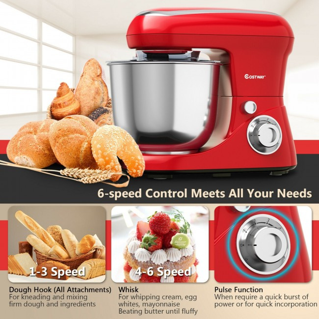 The stand mixer can perfectly deal with all kinds of ingredients ranging from cream and egg whites to heavy dough; serving to let you enjoy everyday cooking. Power motor ensures a more efficient way to mix food; which keeps the freshness and smoothness of food. Six different speeds can meet all your kitchen needs. 3 attachments are available for multi-purpose use; which perfectly do all kinds of food mixing such as cream; knead; beat and whip. On the bottom; four non-slipping pads help to keep the stand mixer stable and steady while working. The stainless steel bowl is equipped with a splash guard to keep the kitchen clean.