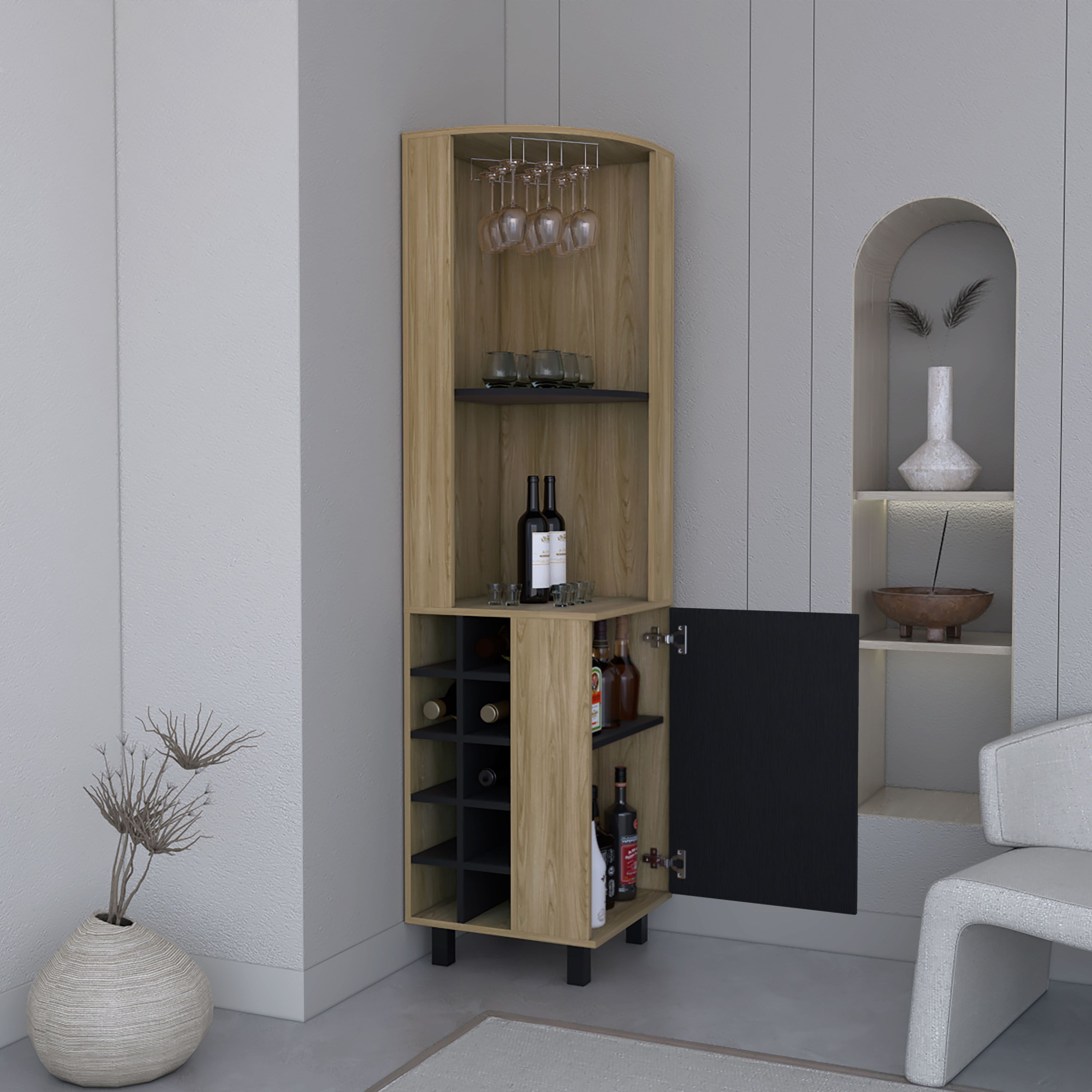 Kaia 70" Tall Corner Bar Cabinet With Four Shelves, Ten Wine Bottle Cubbies and Stemware in Natural Oak - Black Kaia 70" Tall Corner Bar Cabinet With Four Shelves, Ten Wine Bottle Cubbies and Stemware in Natural Oak - Black Kaia 70" Tall Corner Bar Cabinet With Four Shelves, Ten Wine Bottle Cubbies and Stemware in Natural Oak - Black Kaia 70" Tall Corner Bar Cabinet With Four Shelves, Ten Wine Bottle Cubbies and Stemware in Natural Oak - Black Kaia 70" Tall Corner Bar Cabinet With Four Shelves, Ten Wine Bottle Cubbies and Stemware in Natural Oak - Black Kaia 70" Tall Corner Bar Cabinet With Four Shelves, Ten Wine Bottle Cubbies and Stemware in Natural Oak - Black Kaia 70" Tall Corner Bar Cabinet With Four Shelves, Ten Wine Bottle Cubbies and Stemware in Natural Oak - Black