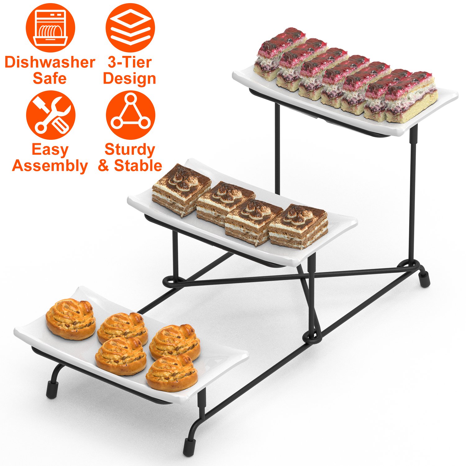 3-Tier Plastic Serving Tray Dessert Server Display Serving Stand Dinnerware with 3 Rectangular Plastic Serving Platters Metal Stand for Entertaining F