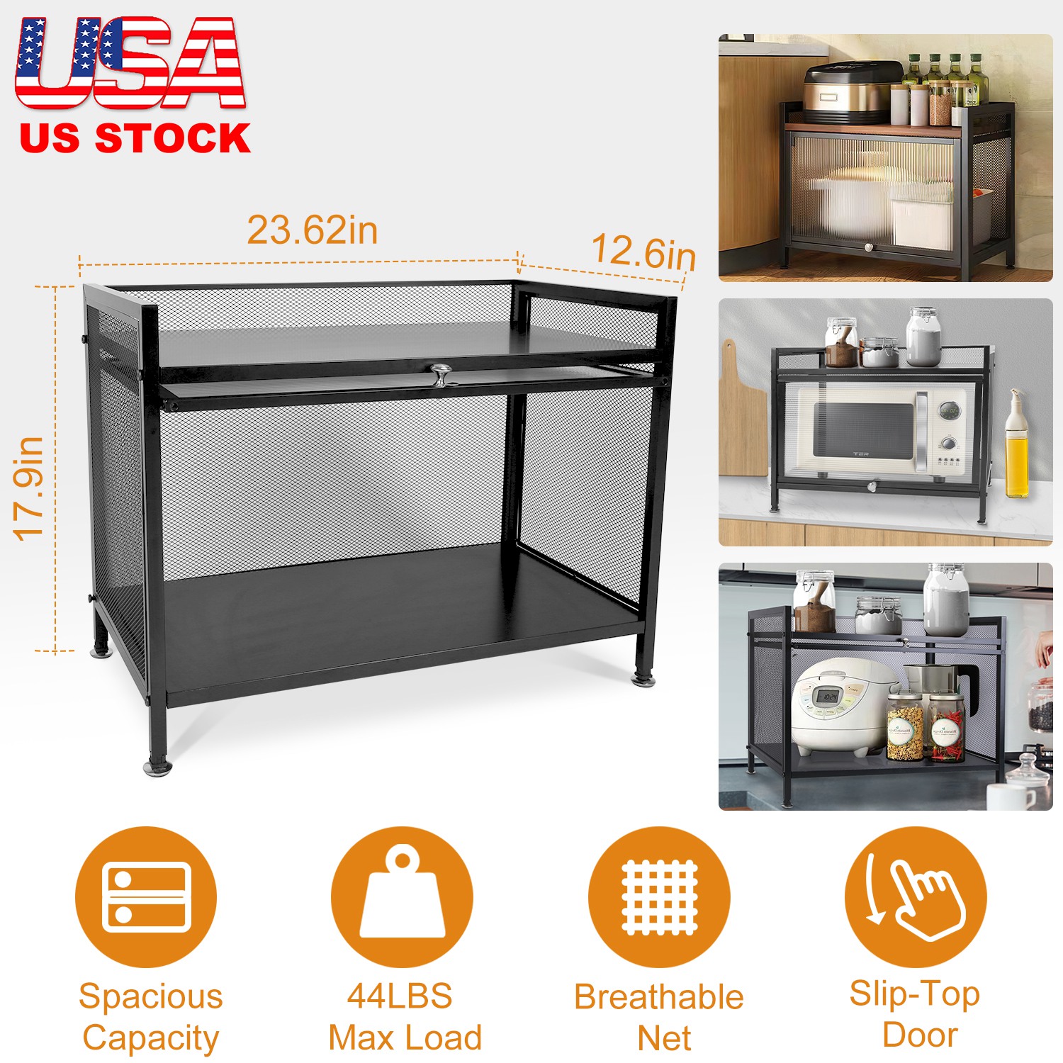 Bakers Rack Carbon Steel Kitchen Storage Cabinets Microwave Stand Kitchen Shelves with Microwave Compatibility Translucent Door Net Panel