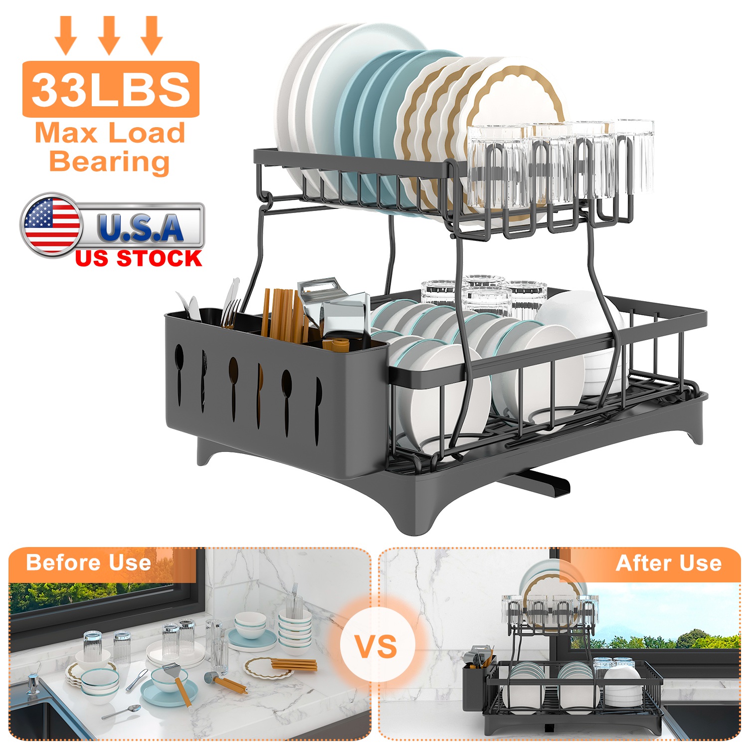 Home > Dish Drying Rack with Drainboard Detachable 2-Tier Dish Rack Drainer Organizer Set with Utensil Holder Cup Rack Swivel Spout for Kitchen Counter