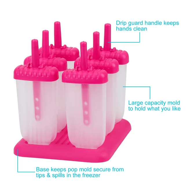 *Considerate Drip-Guard Handle*:Reduce sticky hands and lost juice with these unique drip-guard handles. The base creates a small bowl around the center stick,which collects any drips from melting ice pops.