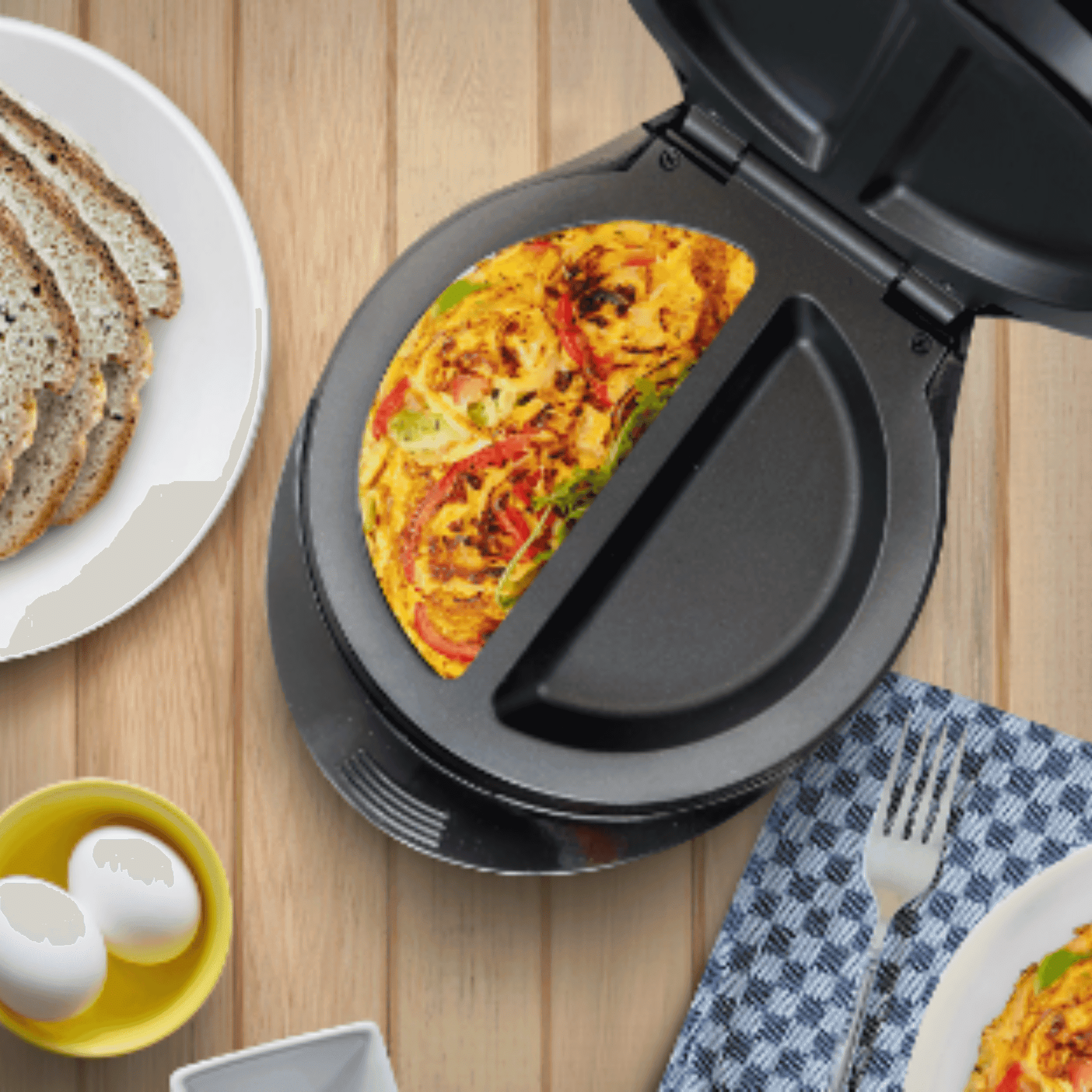 - Cooks two omelets at once (no flipping required)